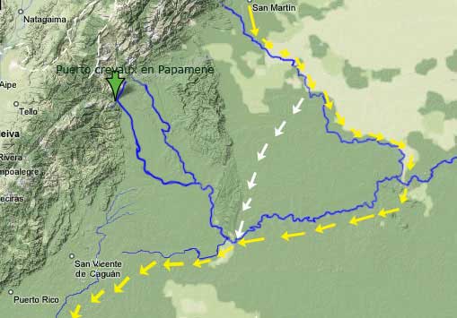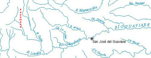 Como ven en las siguientes imágenes el río Papamene es hoy en día apenas un brazo del nacimiento del Guayabero al que se une el llamado Duda nombres netamente españoles que deben haber suplantado al general de Papamene. Empezamos a llamar a esta gran masa de agua río Guaviare, a partir de la desembocadura del Aríari.