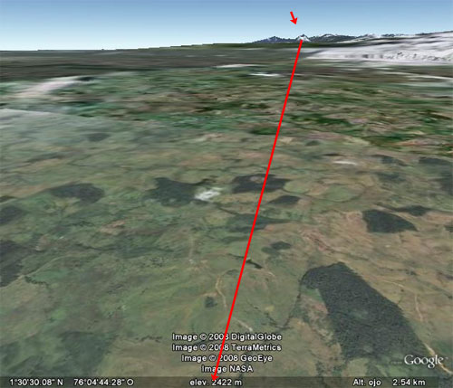 Las flechas en blanco en el mapa son el cruce del padre Aguado y es la diferencia con la versión de Fernández de Oviedo que está en Amarillo. En la siguiente imagen satélite, están establecidos, alturas y los ríos.