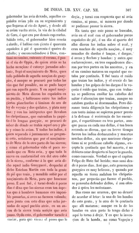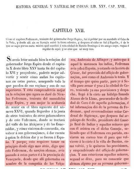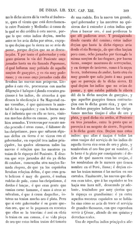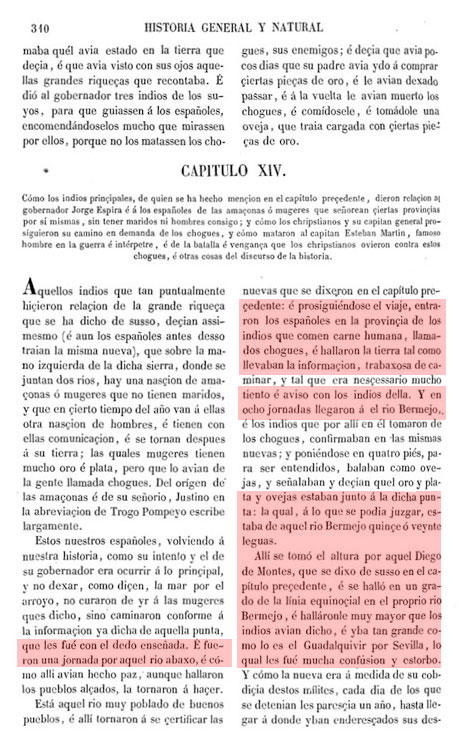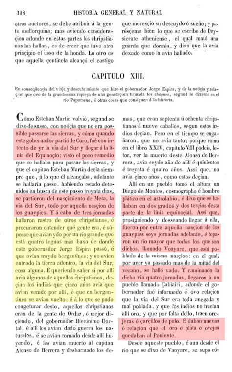 De estos propios soldados que aquí se hallaron con Jorge Espira han querido y aún quieren afirmar que esta noticia que con astucia de haber libertad les dio esta india de haber visto y conocer españoles en aquella tierra y están en la parte dicha, es cierta y verdadera, y que es la gente que don Diego de Ordaz perdió viniendo al Marañón; y lo que acerca de esta gente de Ordaz hay que saber yo lo tengo escrito en esta Historia, tratando de aquella propia jornada, y los propios soldados de Ordaz que hoy son vivos afirman que en el Marañón no se perdió ninguna gente de los de su compañía, sino en unos bajos.....