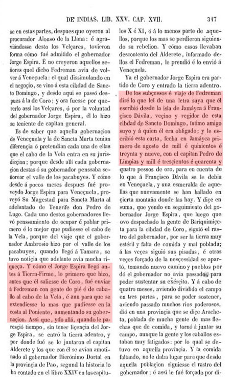 .....Según atrás queda dicho, como por no verse Fredemán con su Gobernador Jorge Espira dejase el camino de la sierra pasados los ríos Apure y Zarare y se metiese por lo llano....Enviando así a Pedro de Limpias con alguna gente que fuese descubriendo a buscar algún lugar para invernar porque ya se acercaba el invierno, el se partió en su seguimiento con todo el resto de la gente. Pedro de Limpias caminó lo que pudo hasta llegar a un río llamado El Pauto, donde halló cantidad de pueblos y abundancia de comidas y sitio acomodado para tener el invierno....Pasó el invierno sin sucederles cosa próspera ni adversa y luego empezaron a tener algunas rarezas las aguas y prosiguió su camino...