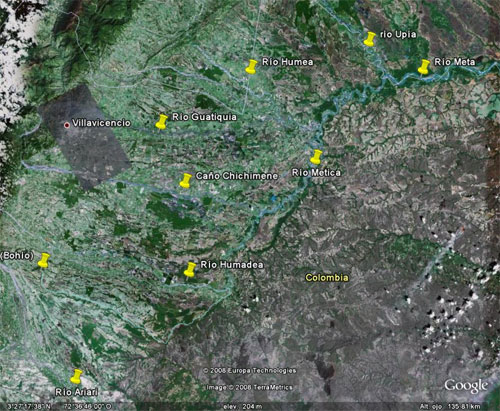 La siguiente imagen que muestra la dimención de los ríos, les aclara la controversia y nos deja ver que no está equivocado Fernández de Oviedo al decir que el nacimiento de Meta es el lugar del Bohío o pueblo de Nuestra Señora, Tampoco lo está Aguado al considerar que el nacimiento del Meta es el río Upía. |