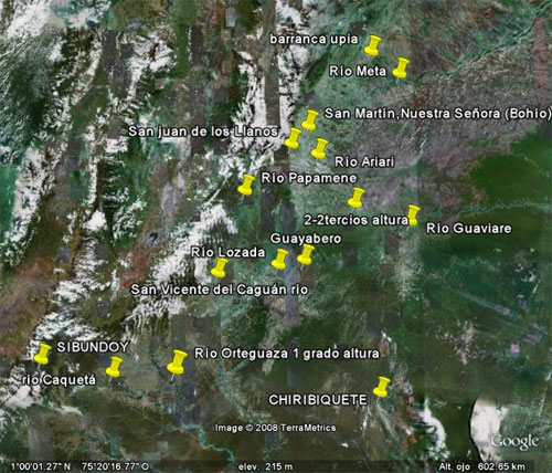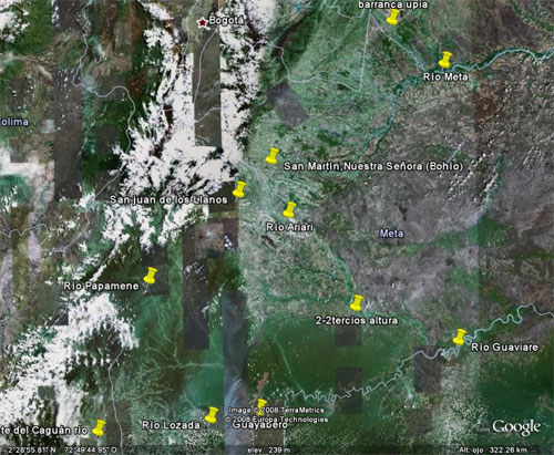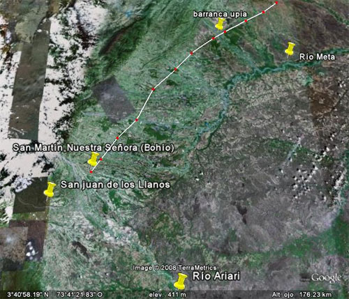 En esta imagen Satélite ubico el sitio de Nuestra señora en la actual población de San Martín, y la localización de la primera población española del llano que se mantuvo pocos años, llamada San Juan de los Llanos.